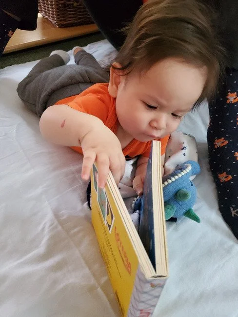 Exploration, discovery, and experience of how the world works are significant aspects of the development for the children in an infant group and thus forms what some would call “curriculum.” Knowing the developmental needs of children at this age, the teachers are very intentional about supporting and encouraging all aspects of their physical, cognitive, social, and emotional growth. For example, children’s large and fine motor skills are rapidly blossoming. Just weeks ago, only a limited portion of the room was being utilized for the children as they had their first experiences rolling over and creeping. Fast forward to this week and a room set up that includes many more things to explore that are a distance from the “home base” in the center of the room. These “destinations” delight the children who are now crawling, sitting, and pulling up to standing. They are motivated to challenge themselves to motor their way to the new areas. This can be strenuous work for a baby, but it is precisely what they crave and supports all domains of their development. It is heartwarming to celebrate with each child as they work with perseverance to master new skills, have confidence in themselves to take risks and show their innate desire to explore and learn.